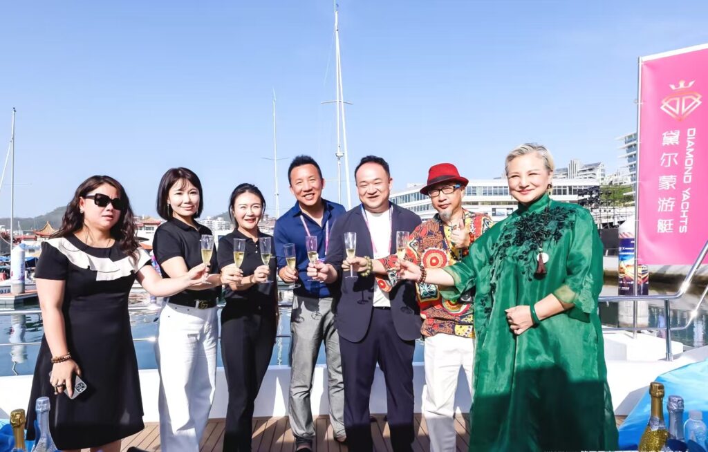 戴文胜导演一行全方位的参观考察后,应邀出席黛尔蒙P56游艇全球首发首秀活动,在第五届消博会三亚游艇展区完成首单的游艇交接剪彩仪式和游艇香槟派对。