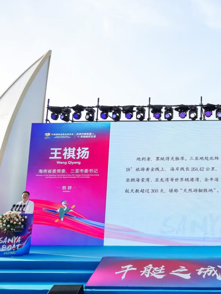 王祺扬代表三亚市委、市政府向国内外嘉宾表示热烈欢迎,他表示,三亚将聚焦打造国际旅游消费中心核心区,深耕游艇产业改革发展创新试验区建设,加快推动游艇产业补链延链、优化升级,大力推进“游艇+旅游+会展+文创”等融合发展,着力构建游艇研发、设计、生产、展示、销售、维修、消费全产业链,不断提升“千艇之城”能级,擦亮“亚太游艇之都”城市名片。期待进一步加强与国内外游艇发展先进地区的交流合作,期待游艇企业前来三亚投资兴业,共享自贸港建设新机遇,共拓游艇产业新蓝海,共创游艇经济新辉煌。