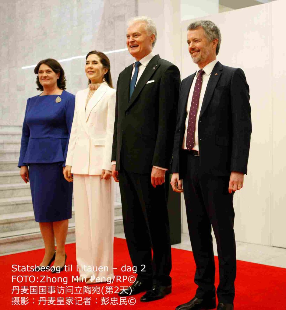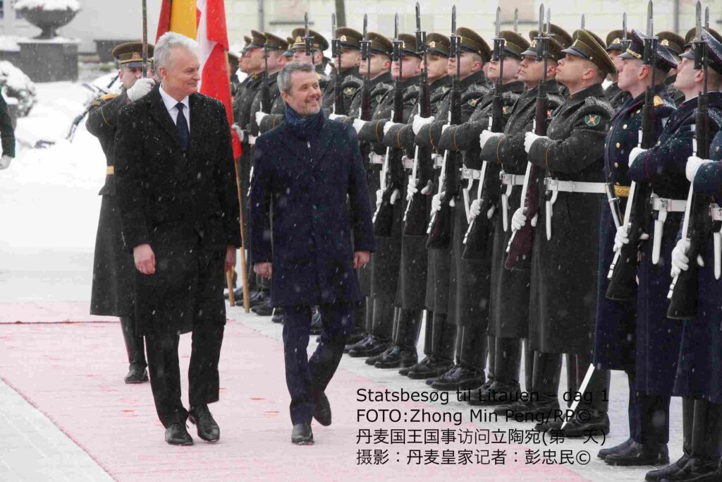 1月28日下午,在维尔纽斯总统府,丹麦国王与王后受到立陶宛总统吉塔纳斯·瑙塞达和第一夫人戴安娜·瑙塞迪涅的正式欢迎,丹麦国王在总统陪同下检阅了仪仗队。