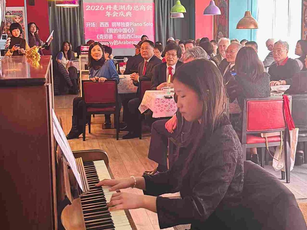 庆典在钢琴演奏中拉开帷幕。华裔青年李肖雅熙先后演奏《我的中国心》与德彪西《Arabesque》,传递海外侨胞的家国情怀,同时彰显中丹文化交流的深厚底蕴。现场氛围温馨热烈,中丹两国嘉宾交流互动,围绕经贸合作、侨胞发展等议题展开探讨,为后续合作奠定良好基础。