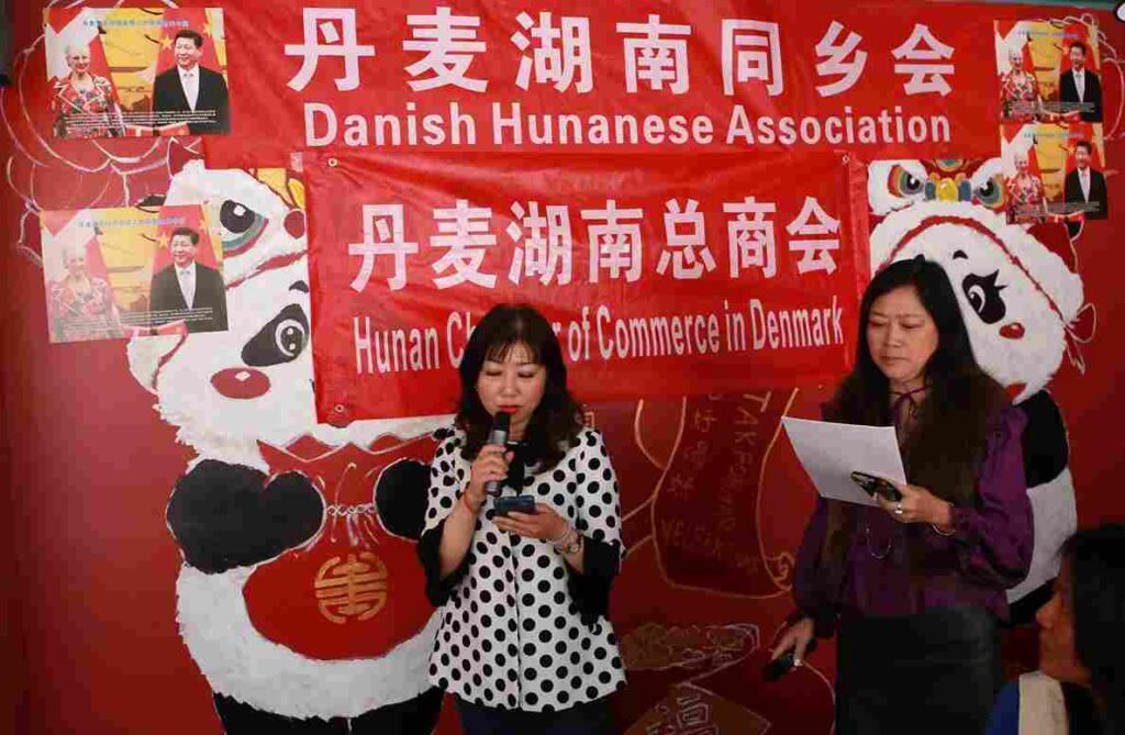 中国驻丹麦大使王雪峰及夫人童新、办公室主任沈昂、领事杨佳瑞,匈牙利驻丹麦使馆代表János Kertezs,丹麦外国记者协会主席Osama Al-Habahbeh,哥本哈根国际俱乐部创始人Hasse Ferrold,丹麦香港贸易协会创始人Ole Christoffersen夫妇,Danish Group ApS创始人Samvel Akopian,丹麦国际事务特别顾问Janne A. Dyving,丹麦安徒生文化艺术发展委员会主席Finn Andersen,丹麦皇家音乐学院教授Gert Mortensen等嘉宾出席活动。丹麦湖南总商会名誉会长杨慕君,会长肖灵艳,副会长彭忠民、冯伟,秘书长黄姝婕,以及各社团代表、企业家代表共同参加庆典。