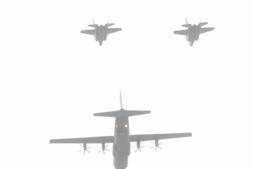 Tre F-16-fly fra jagereskadrillen i Skrydstrup fløj i formation over Christiansborg Slotsplads som en del af en flyveopvisning, hvor de fløj fra vest og op langs vestkysten.
