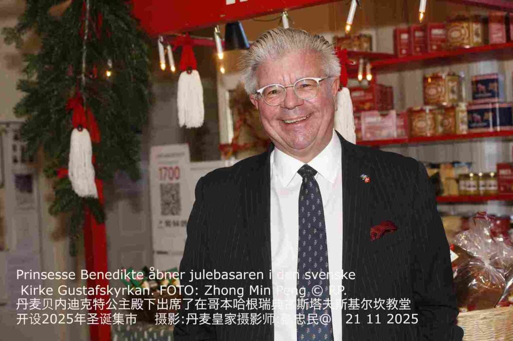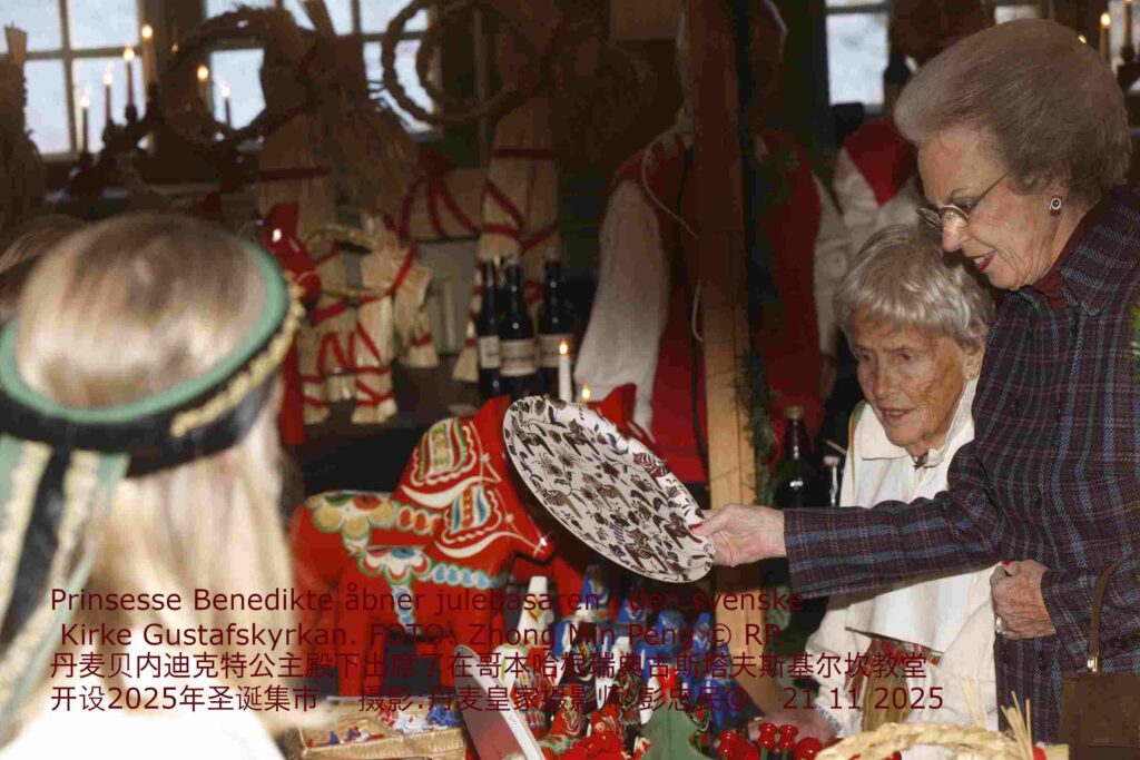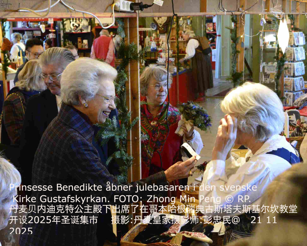 H.K.H. Prinsesse Benedikte af Danmark besøgte den 21. november 2025 den årlige julebasar i Gustafskyrkan, den svenske kirke i København.