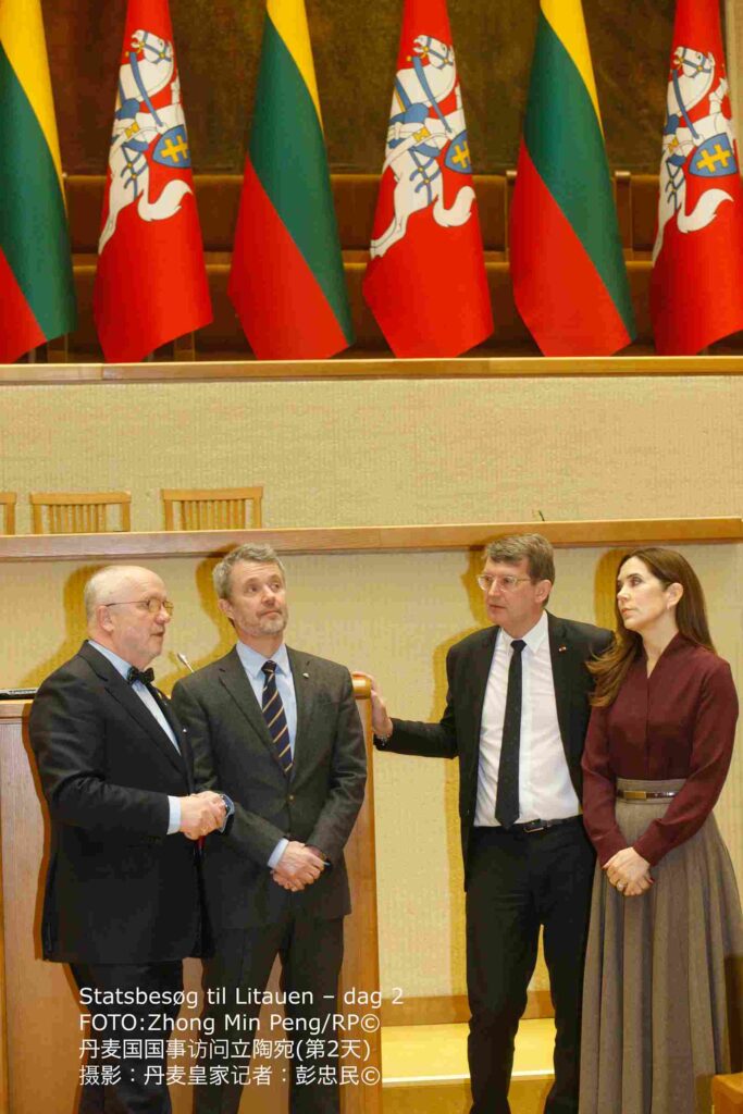 ‘Dagens program fortsatte med et besøg i Litauens parlament, Seimas, hvor Deres Majestæter blev modtaget af parlamentsformand H.E. Juozas Olekas. Kongeparret fik herefter en rundvisning i parlamentet med fokus på Litauens selvstændighed og bygningens historiske elementer, herunder 11. marts-parlamentssalen, hvor Litauen erklærede sin uafhængighed af Sovjetunionen. Besøget blev afsluttet ved mindesmærket for 13. januar 1991 uden for Seimas.